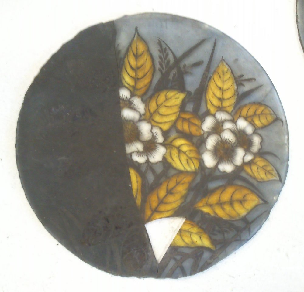 The quarries are a mix of elegant painted flowers but incredibly dirty having probably at least 80 years of London grime on them. The paint on some is fragile and unstable.